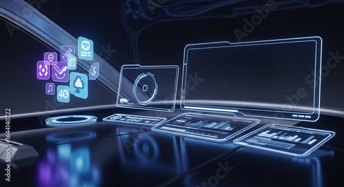 © AbdullahAl, Fototapeta premium Futuristic holographic interface with glowing blue and purple neon lights displaying data and app icons on a futuristic computer screen