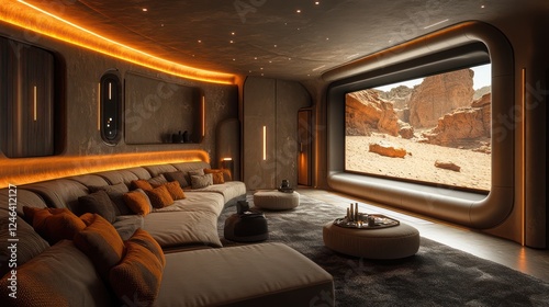 © tydeline, Fototapeta premium Futuristic Home Theater with Desert Landscape Screen
