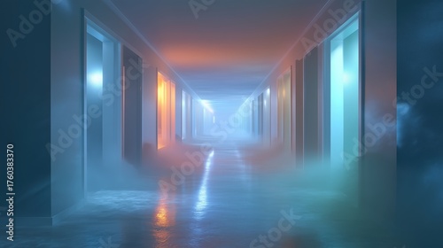 © Niroa, Fototapeta premium Futuristic Hospital Corridor with Blue and Orange Lighting