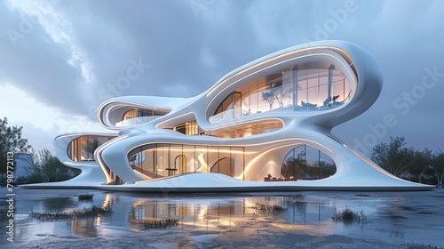 Fototapeta premium futuristic house made of white concrete with large glass windows reflecting...
