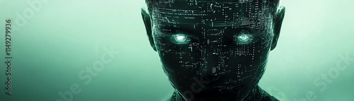 © Itsaree , Obraz premium Futuristic humanlike figure with a visible brain, advanced technology integrated into the digital environment, glowing circuits, holographic elements, cybernetic atmosphere