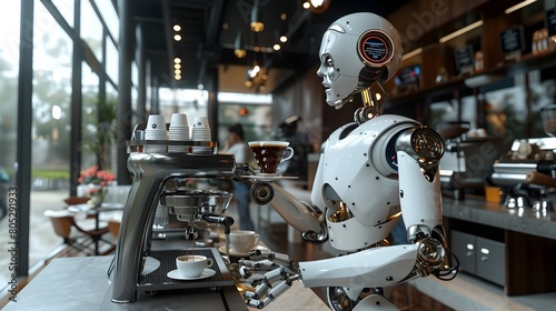 Fototapeta premium Futuristic Humanoid Robot Barista Preparing Coffee in Sleek Modern Cafe with...