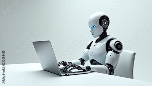© ANDREY PROFOTO, Naklejka premium Futuristic humanoid robot interacting with laptop