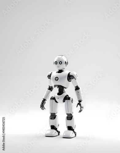 © Suraaj, Fototapeta premium Futuristic Humanoid Robot Standing on White Background - AI Technology, Robotics, and Automation Concept