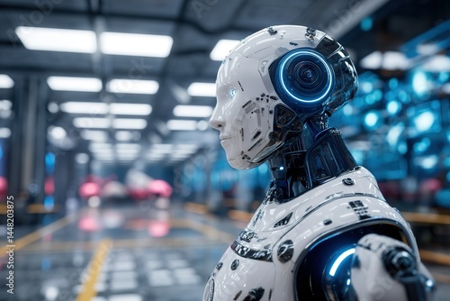 © YanabY, Fototapeta premium Futuristic humanoid robot stands in a modern technological facility showcasing advanced artificial intelligence design