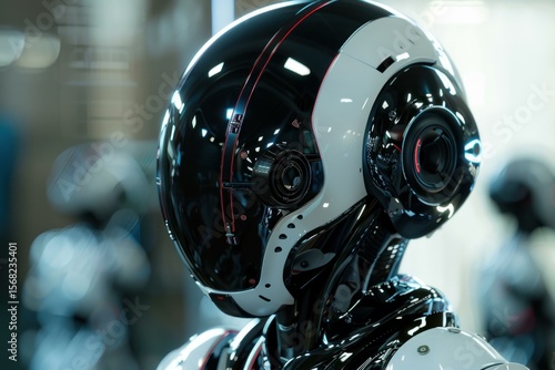 © juliars, Fototapeta premium Futuristic humanoid robot with a black and white helmet is standing in a research laboratory