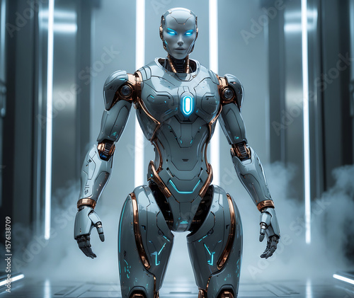 Fototapeta premium Futuristic humanoid robot with glowing blue eyes and metallic accents android...