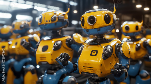 Obraz premium Futuristic Humanoid Robots with Yellow and Teal Exteriors on a Factory...