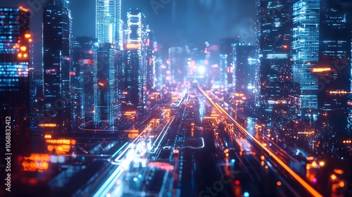 © Thares2020, Fototapeta premium Futuristic Illuminated City with Seamless AI Powered Infrastructure and Transportation