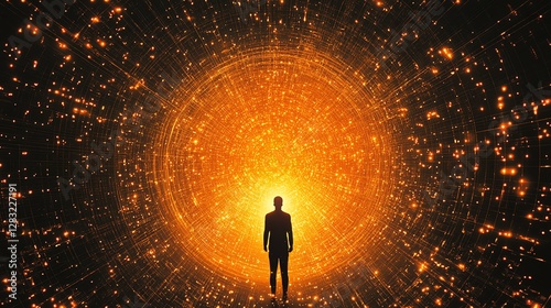 © SUKHUM, Fototapeta premium Futuristic illustration of a global network, a central figure surrounded by orangelit connections between individuals, symbolizing the interconnectedness of people