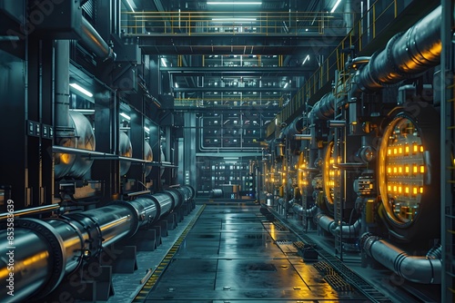 © lertsakwiman, Fototapeta premium Futuristic Industrial Battery Storage Facility with Towering Modular Cell Racks and Oxidation Processes