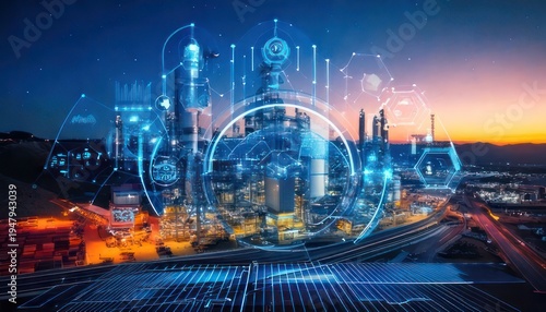 © Sandem, Obraz premium Futuristic Industrial Complex with Digital Network Overlay at Sunset.