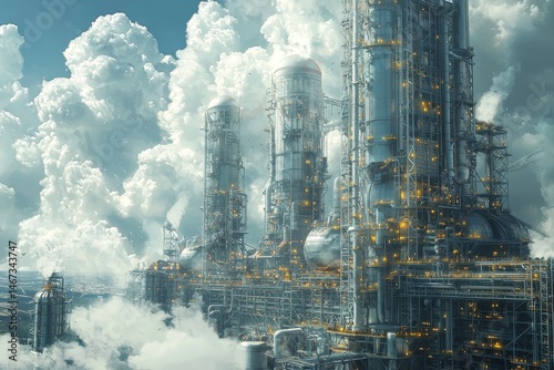 Fototapeta premium Futuristic Industrial Complex with Towering Structures and Dramatic...
