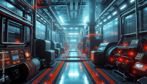 Fototapeta premium Futuristic Industrial Corridor with Neon Lights and Machinery