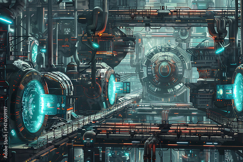 Fototapeta premium Futuristic Industrial Machinery with Glowing Blue Accents