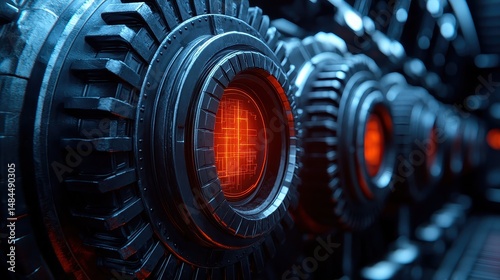 Fototapeta premium Futuristic Industrial Mechanism with Glowing Red Circles and Metallic Gears...