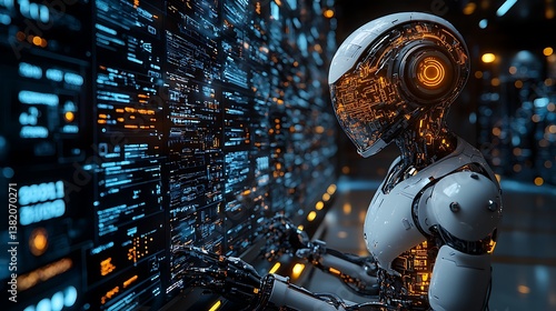 © Rafhan Aldiz, Fototapeta premium Futuristic Interface: A sleek android interacts with a digital interface, its metallic form reflecting the glow of data streams in a captivating composition.