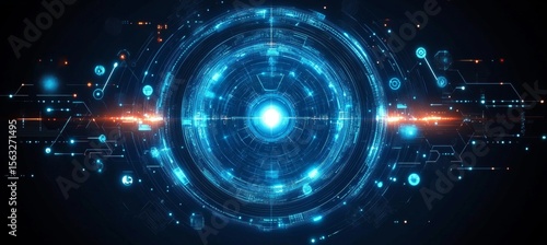 © Ilja, Obraz premium Futuristic Interface Design with Glowing Dome Shield and HUD Elements on a Blue Background