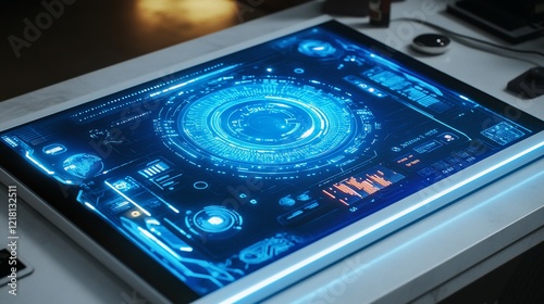 Obraz premium Futuristic interface display on desk, glowing blue, office background, tech presentation