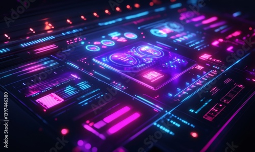 Obraz premium Futuristic interface displaying complex data analysis with glowing neon charts, graphs, and control panels