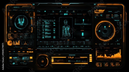 Fototapeta premium Futuristic interface displaying data and holographic representation of a humanoid figure.