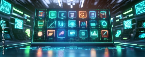 Obraz premium Futuristic interface displaying various data and analytics icons.