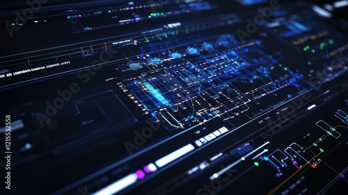Obraz premium Futuristic interface showcasing complex data analysis, building schematics,...