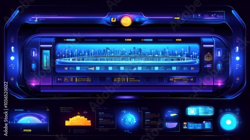 © CHURIN, Obraz premium Futuristic interface with a city skyline and data displays.