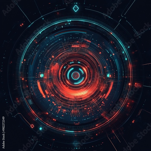 Obraz premium Futuristic interface with concentric circles, glowing in red and blue.