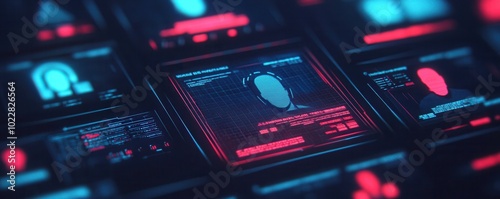 Obraz premium Futuristic interface with digital screens displaying data and profiles.
