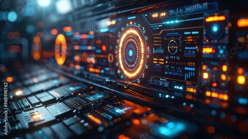 © Ghiska, Obraz premium Futuristic interface with glowing digital display and circuit board.