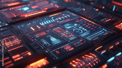 © Fathimah, Obraz premium Futuristic interface with glowing displays and data streams.