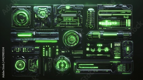 © Rai, Obraz premium Futuristic interface with glowing green elements on a dark background showing complex tech design