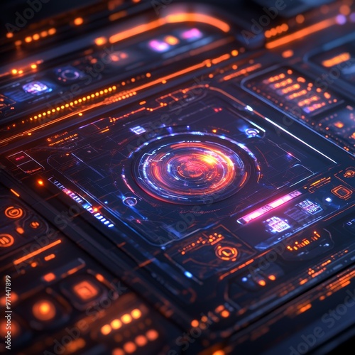 © A4719, Obraz premium Futuristic Interface with Glowing Orange and Blue Lights