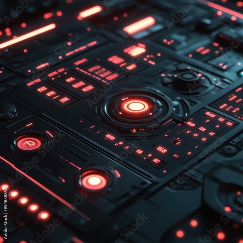 Obraz premium Futuristic Interface with Glowing Red Buttons and Controls.