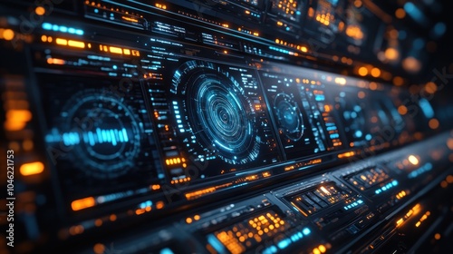 Fototapeta premium Futuristic interface with glowing screens and data displays.