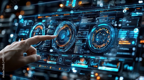 © Riko, Obraz premium Futuristic interface with hand gestures navigating digital data on a high-tech screen