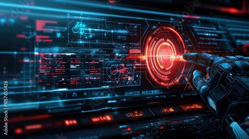 Obraz premium Futuristic Interface with Robotic Interaction and Data Visualization in...