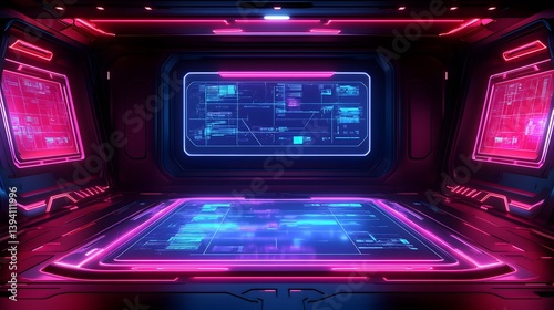 Obraz premium Futuristic interior illuminated with bright neon colored graphical interfaces