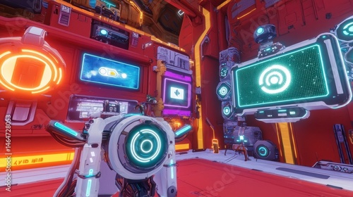 Fototapeta premium Futuristic interior scene with glowing technological displays.