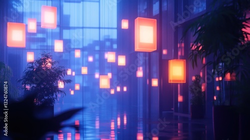 © Lesuna, Naklejka premium Futuristic interior with glowing cubes