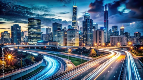 © kittipon, Fototapeta premium futuristic Interstate 80 Illinois cityscape sleek modern atmosphere cool silver tone highway infrastructure urban development city lights neon glow