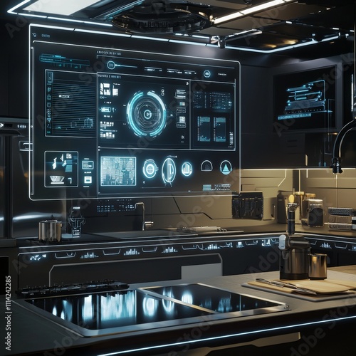 Fototapeta premium Futuristic kitchen with high-tech interfaces and sleek design, blending modern aesthetics with advanced technology.