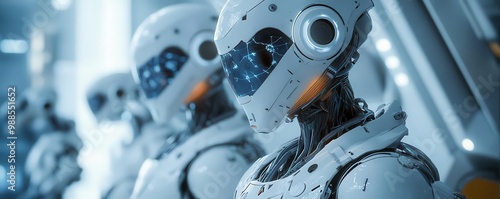 © Kedsaraporn, Fototapeta premium Futuristic lab with robotic assistants, scifi, blue and white, digital illustration