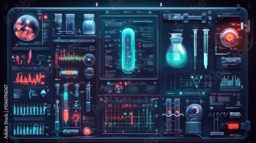 Obraz premium Futuristic Laboratory Interface with Data Visualizations, Scientific Equipment, and Bio-samples