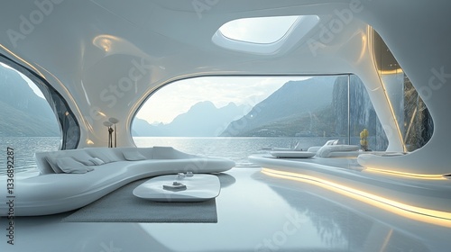 © Zidan, Fototapeta premium Futuristic Lakeside Living Room: Panoramic Mountain Views