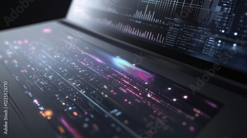 © RN 3540, Obraz premium Futuristic laptop displaying data streams and graphs.