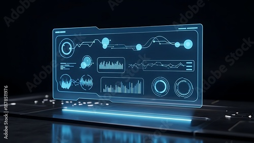 © hasan, Obraz premium Futuristic laptop displaying glowing blue data analytics interface on dark background.