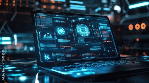 © Adiba sakila atmarin, Obraz premium Futuristic laptop displaying holographic data interface.