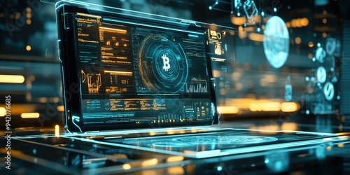 © Murda, Fototapeta premium Futuristic laptop with Bitcoin symbol on screen.